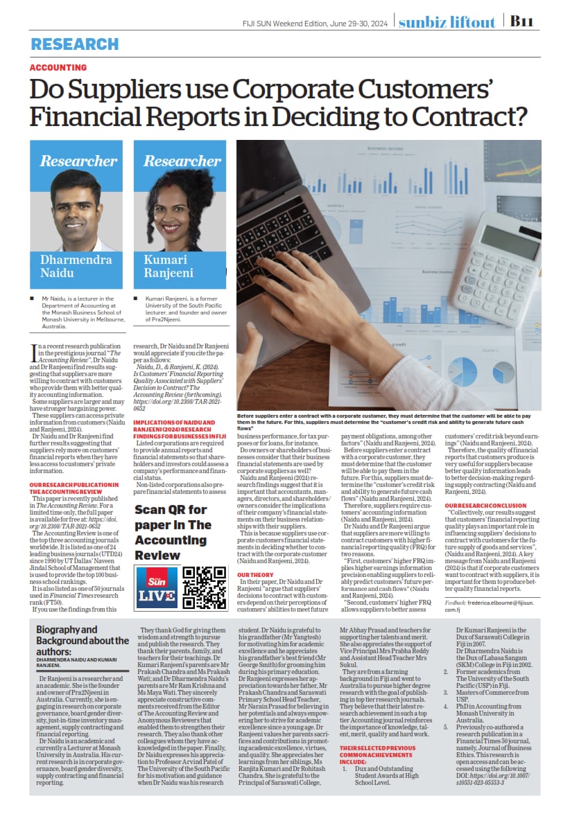Pleased to share that the findings from my co-authored research in the area of Financial Reporting Quality and Supply Contracts was covered by the media. Our research highlights the importance of financial reporting quality in supply contracting (Naidu and Ranjeeni, 2024).
